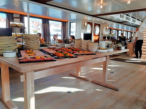 Das Ambiente des Schiffes – eher maritim, nordisch – mit viel Holz, Leinen und Korblampen empfanden wir als ansprechend, ebenso daß eine Rollstuhltoilette und ein Rollstuhllift zum Sonnendeck vorhanden ist.