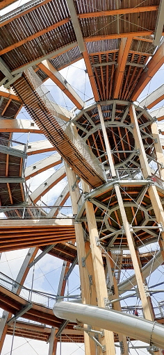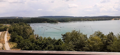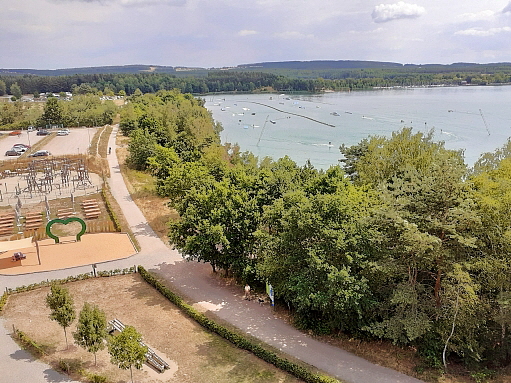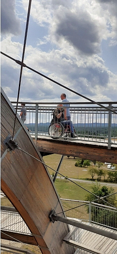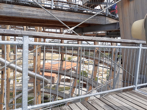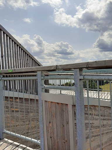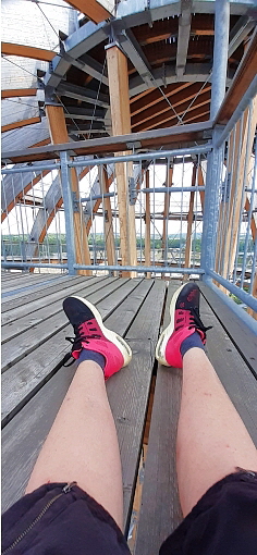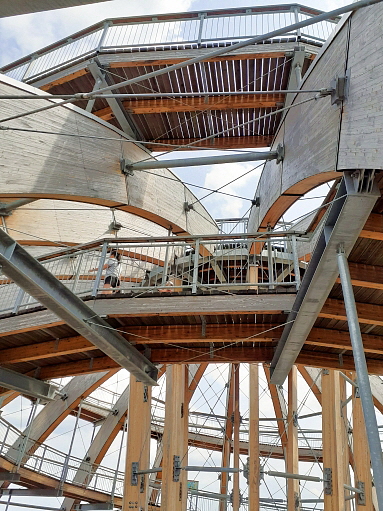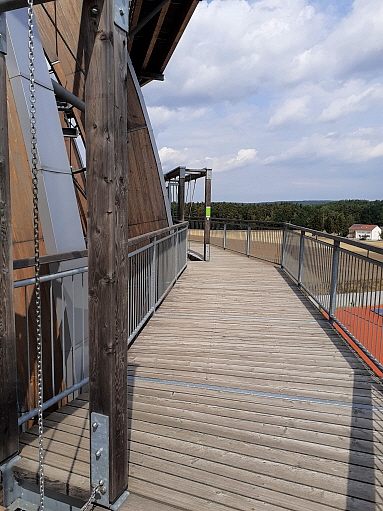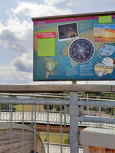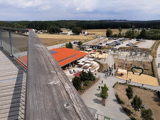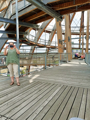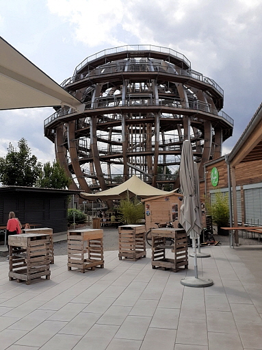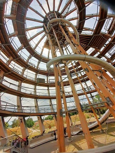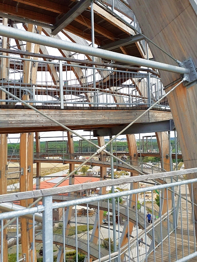 der Anstieg auf die Holzkugel ist prinzipiell wenig steil und normalerweise gut machbar ... auf 2 Aussen/Erlebnisstationen die gute Beweglichkeit, Koordination und Geschicklichkeit erfordern kann man sich austoben ... ich hätte das nicht machen sollen, denn durch die Anstrengung habe ich es nicht nach oben geschafft und kann auch deswegen leider nichts über den Ausblick von ganz oben berichten, aber die Aussicht im oberen Drittel war auch gigantisch ...