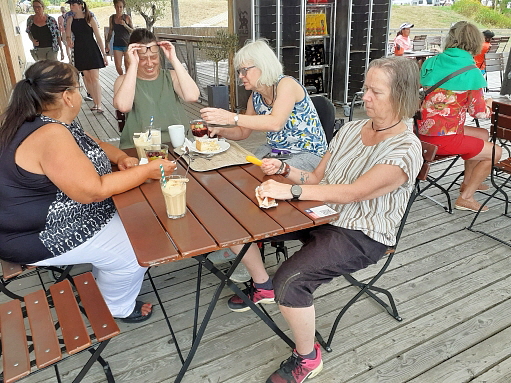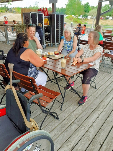 weil wir aber so schön zusammen gesessen sind und so gute Gespräche hatten wollten wir nach der Mittagspause noch nicht wieder heim, also sind wir vorbei an einem wunderschön angelegten Minigolfplatz zur Wakeboardanlage gegangen/gerollt...der Schotter der hier überall am Boden liegt erleichtert das alles leider nicht, aber es haben alle geschafft ... als Belohnung dafür sind wir dann noch auf die Sonnenterrasse und genossen bei bester Aussicht auf den See kalte und heiße Getränke ...