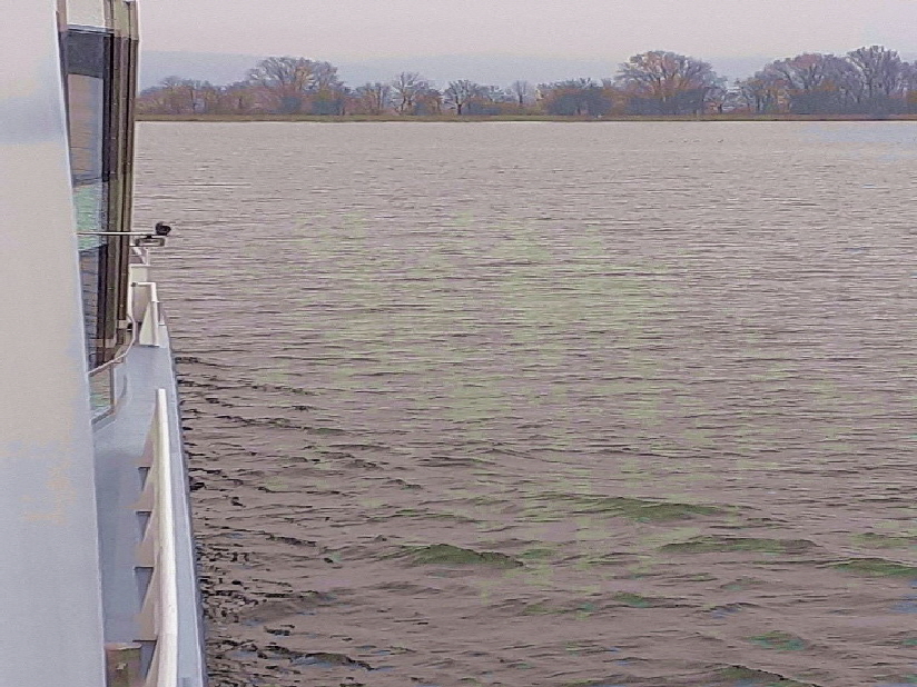 Währenddessen fuhren wir an der grauen, nebligen Landschaft vorbei. Trotz der kühlen Luft gingen einige aufs Deck, aber nicht lange ... Drinnen war es doch gemütlicher. Außerdem waren wir mit dem reichlichen Essen beschäftigt sowie angeregten Gesprächen.